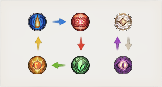 在战斗中,具有优势属性的角色对目标进行攻击时将额外造成25%的伤害,该效果称为「属性克制」。
